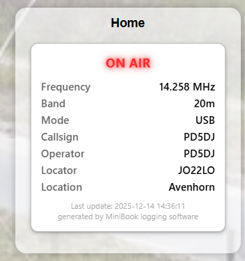 MiniBook v1.5.0b introduces a new feature that extends MiniBook beyond the desktop:the WordPress & HTML Dashboard updater. 🚀 New Feature: WordPress Dashboard Updater MiniBook can now push live station status directly to a website. This enables: Live ON AIR / OFF AIR indication Real-time band, frequency, and mode display WordPress dashboards using shortcodes or widgets…