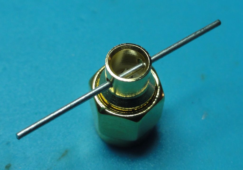 Now take the piece of wire, and cross it through the holes of the SMA connector, the wire comes out exactly above the parallel soldered resistors.
