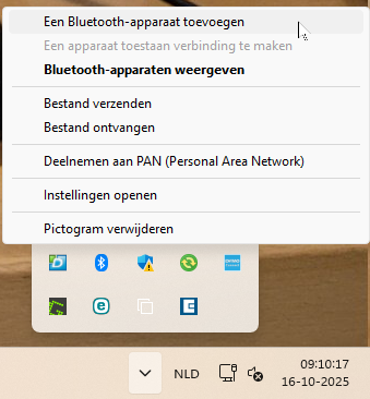 Klik met de rechter muisknop op het Bluetooth Icoontje in de Taakbalk om de pagina Bluetooth en apparaten te openen
