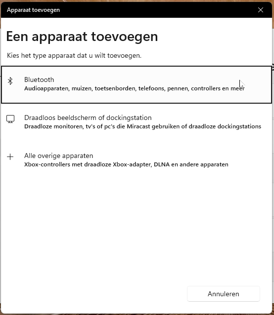 In het venster Apparaat toevoegen kies je de eerste optie: Bluetooth.