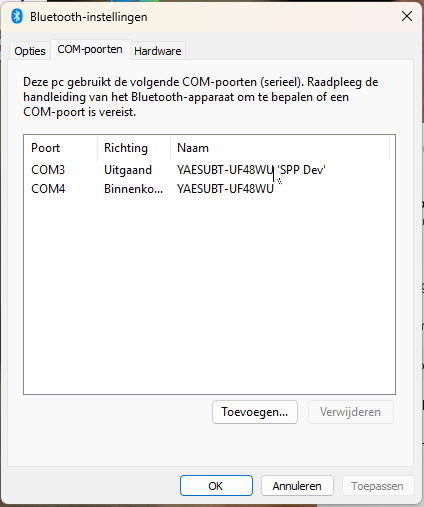 In het venster Bluetooth-instellingen ga je naar het tabblad COM-poorten.