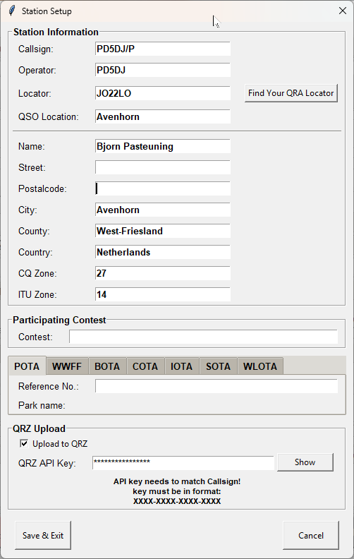 • QRZ API Key – vul hier je persoonlijke QRZ API-sleutel in (formaat: XXXX-XXXX-XXXX-XXXX).